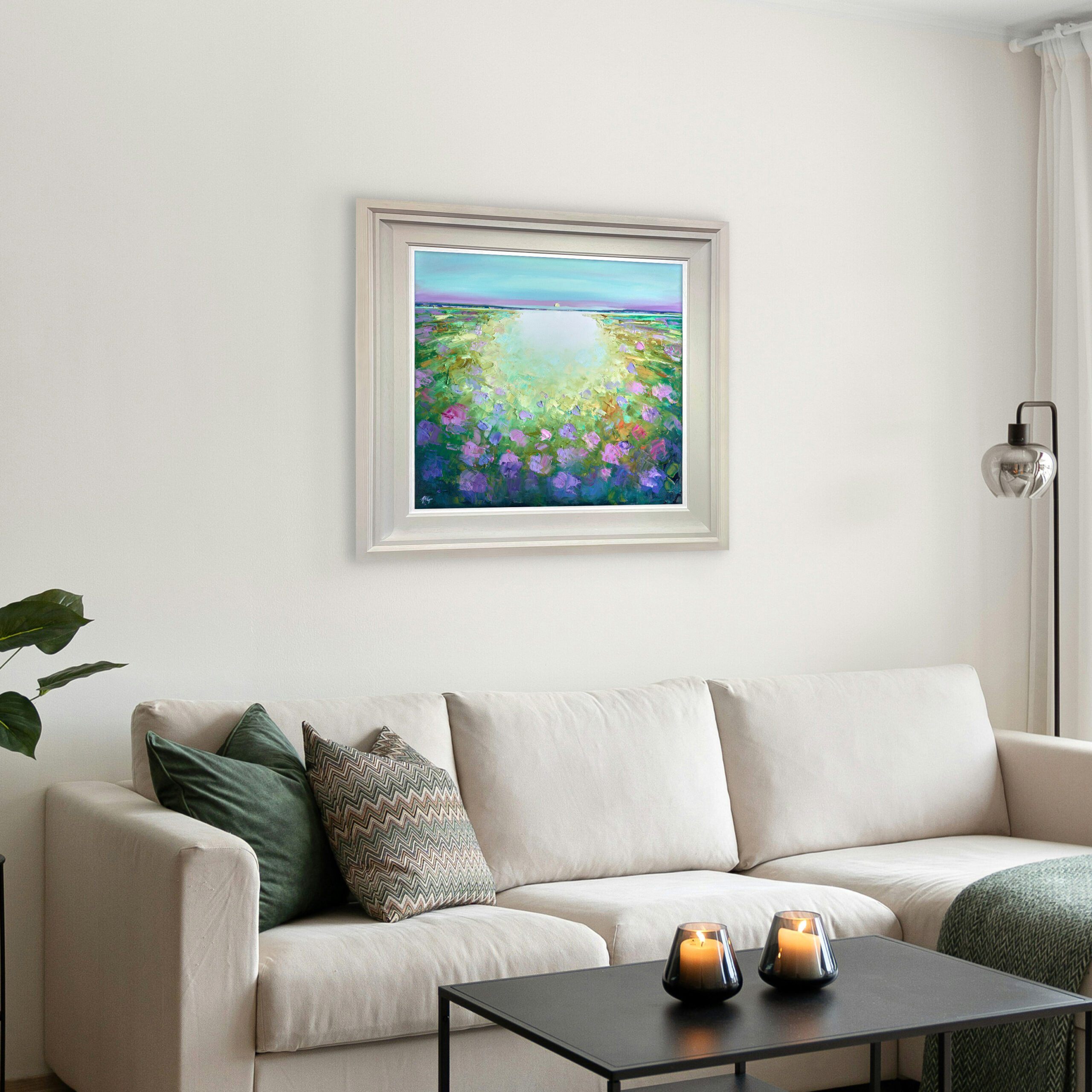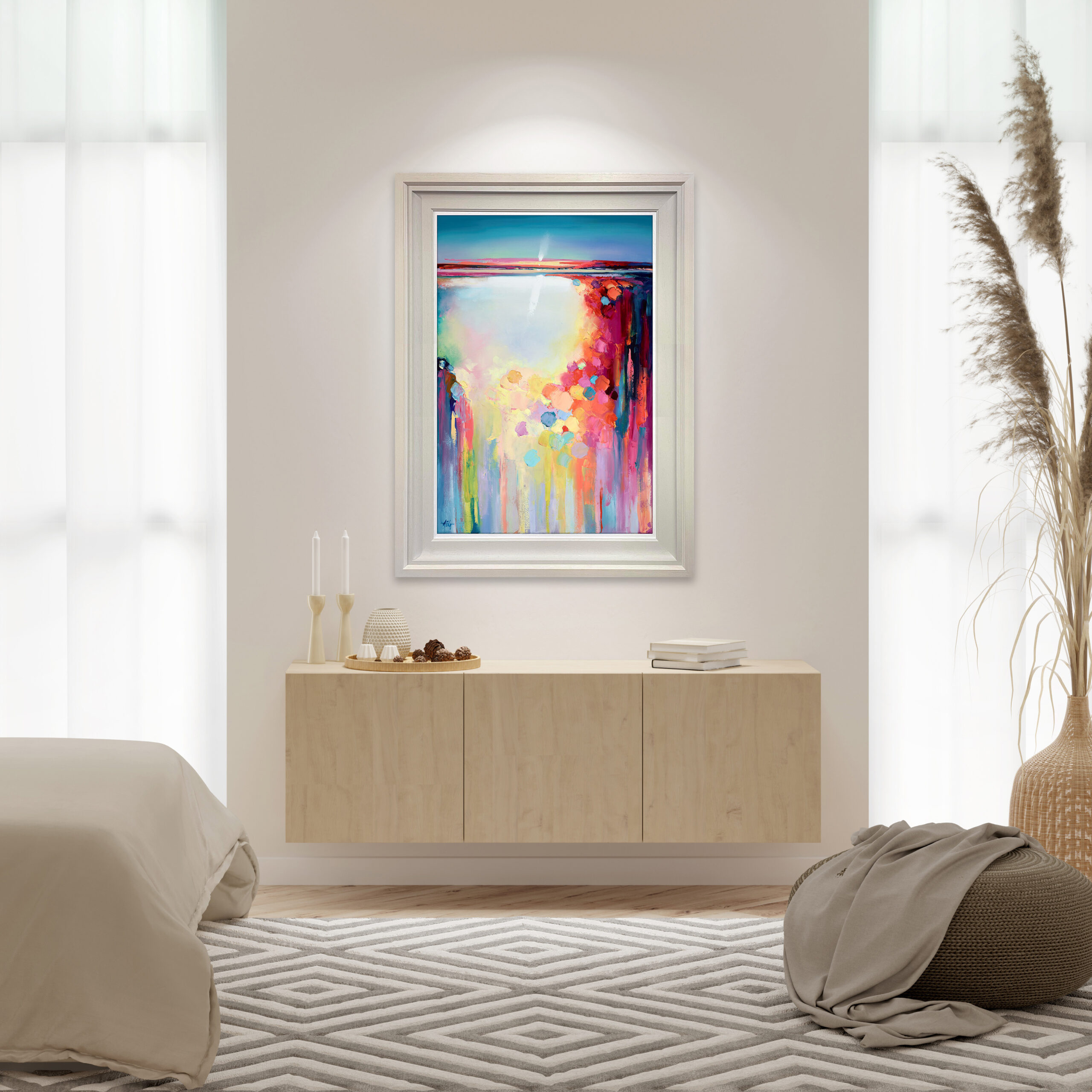 Anna’s creative reconstructions of the landscape capture the beauty and dynamism of stunning harbour locations enhanced by vivid sunsets. It is the combination of colours in a scene that initially attracts her, and this visual harmony compels her to create her own image in response. Each vibrant piece portrays the energy and emotion of the environment with what the artist describes as “exploding skies” which release a whole spectrum of radiant and dramatic colours.