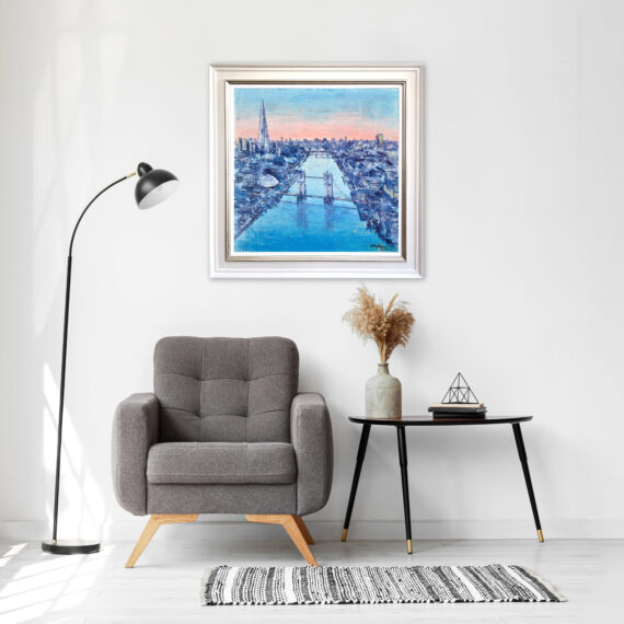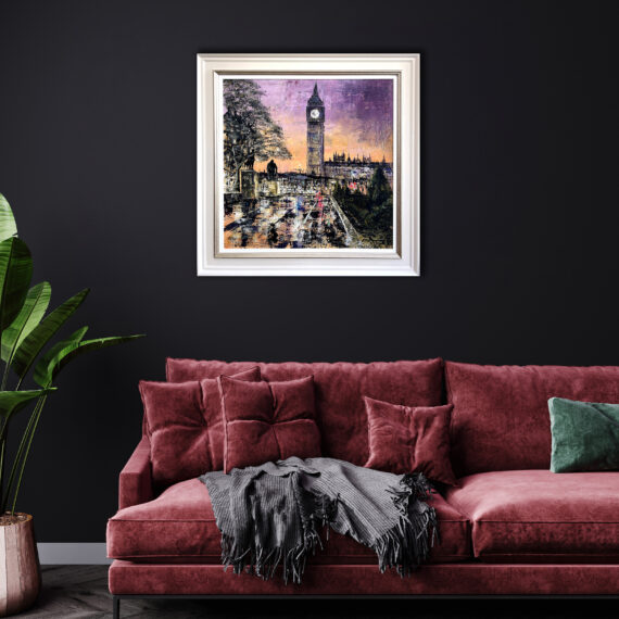 Mark’s stunning images are created with little conventional brush work. Instead, he uses a wide range of alternative tools including rollers and scrapers to achieve the textures and effects which are characteristic of his work. His use of newsprint adds a further layer of texture to each piece; while some of the exposed newsprint is by design, other parts occur naturally where the rollers and scrapers lay the paints unevenly which reflects the unexpected and unpredictable nature of life lived at speed in the city.