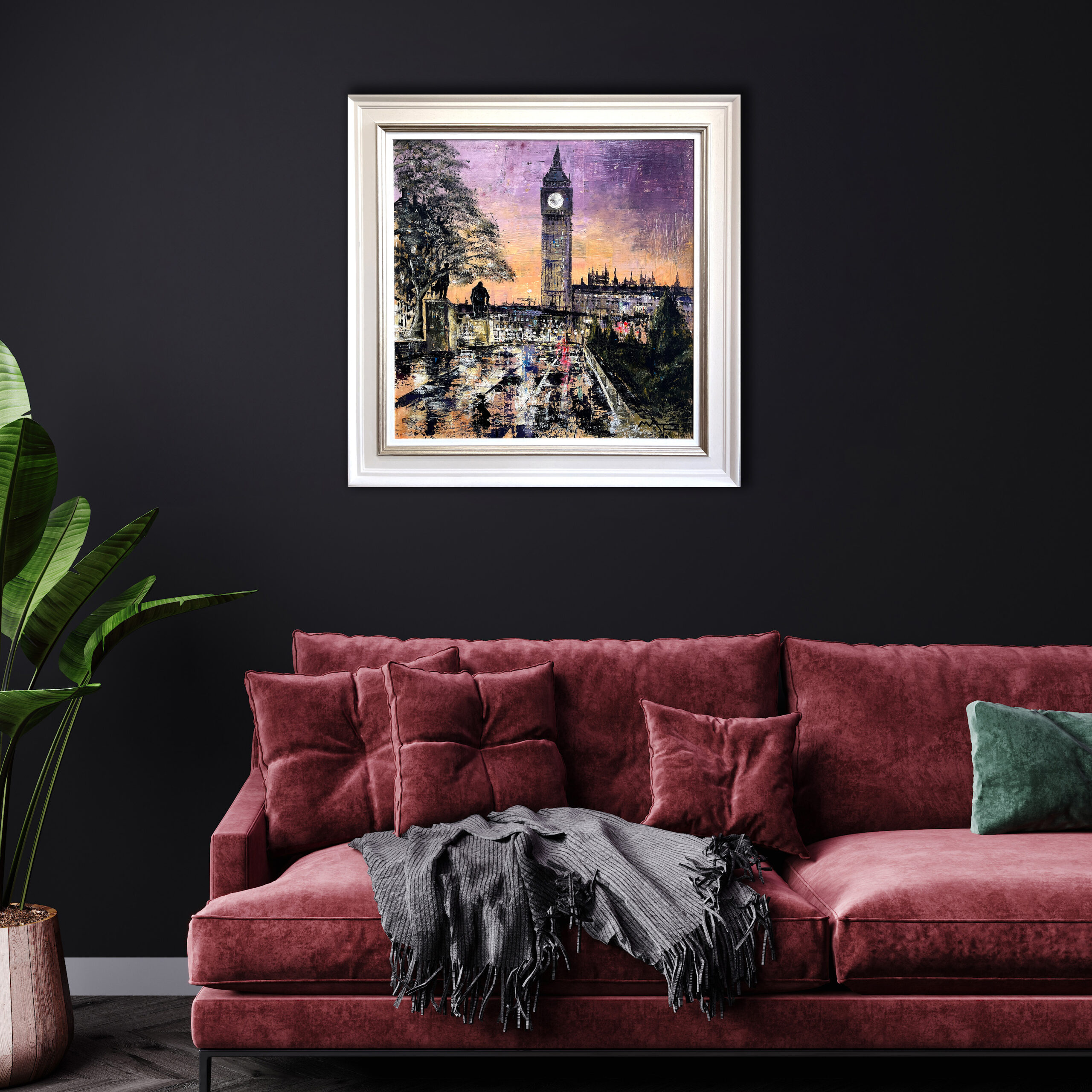 Mark Curryer’s bold, atmospheric cityscapes are inspired by distinctive architecture and the day-to-day trappings of urban life. He is fascinated by the effect of rain on the city, particularly at night, and the way the multiple light sources play in the reflections.